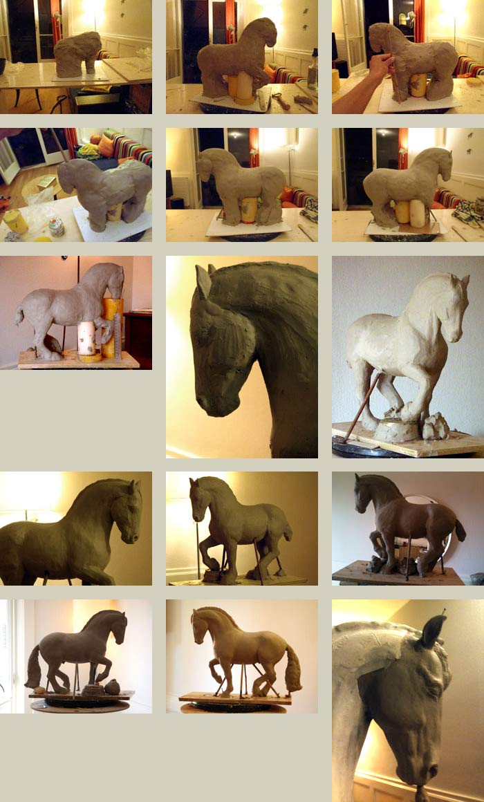 Diese Fotoserie zeigt, wie aus einem Klumpen Ton nach und nach eine Pferdeskulptur wird. Das weiche und nachgiebige Material Ton ist schwer, daher ist das Stützen des Rumpfes und der Beine mit Bambusstäben und festem Draht nötig.
