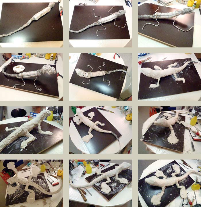 Diese Fotoserie zeigt exemplarisch, wie das direkte Modellieren mit Gips oder Beton angegangen werden kann. Zunächst wird ein Grundgerüst aus Stützmaterialien gebaut, in diesem Beispiel mit Styropor, Draht und Fliegengitter. Anschliessend wird in mehreren Schritten Gips aufgetragen und nach dem Erhärten bei Bedarf mit Feilen und Schabern stellenweise wieder entfernt, bis die gewünschte Form erreicht ist.